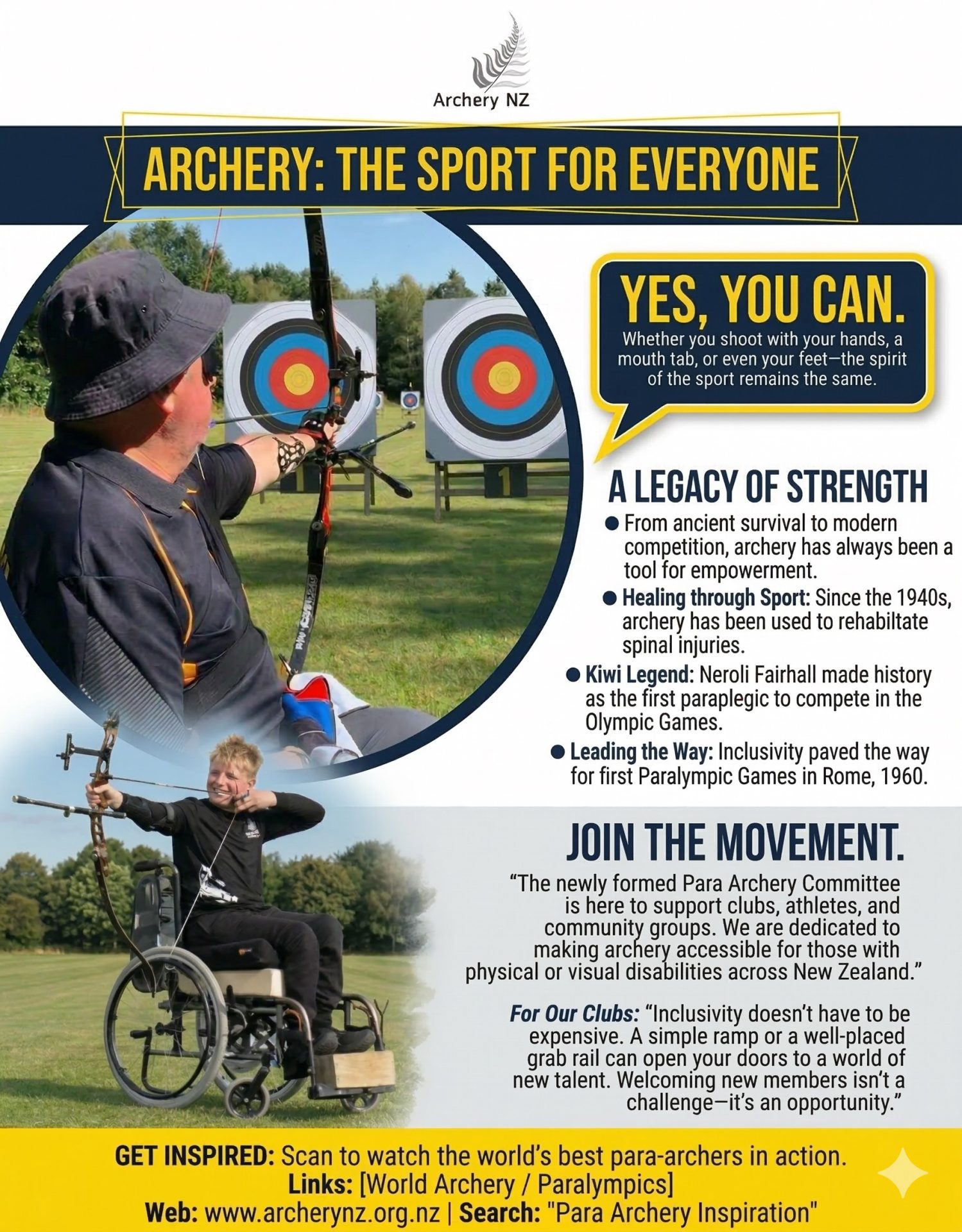 Archery New Zealand recognises that there has been a gap in dedicated support for disabled archery over the last 20 years. Our committee has been established to change that. Our mission is to ensure that archery is a sport with no boundaries—one where every club in the country is equipped to welcome disabled and vision-impaired (VI) archers.